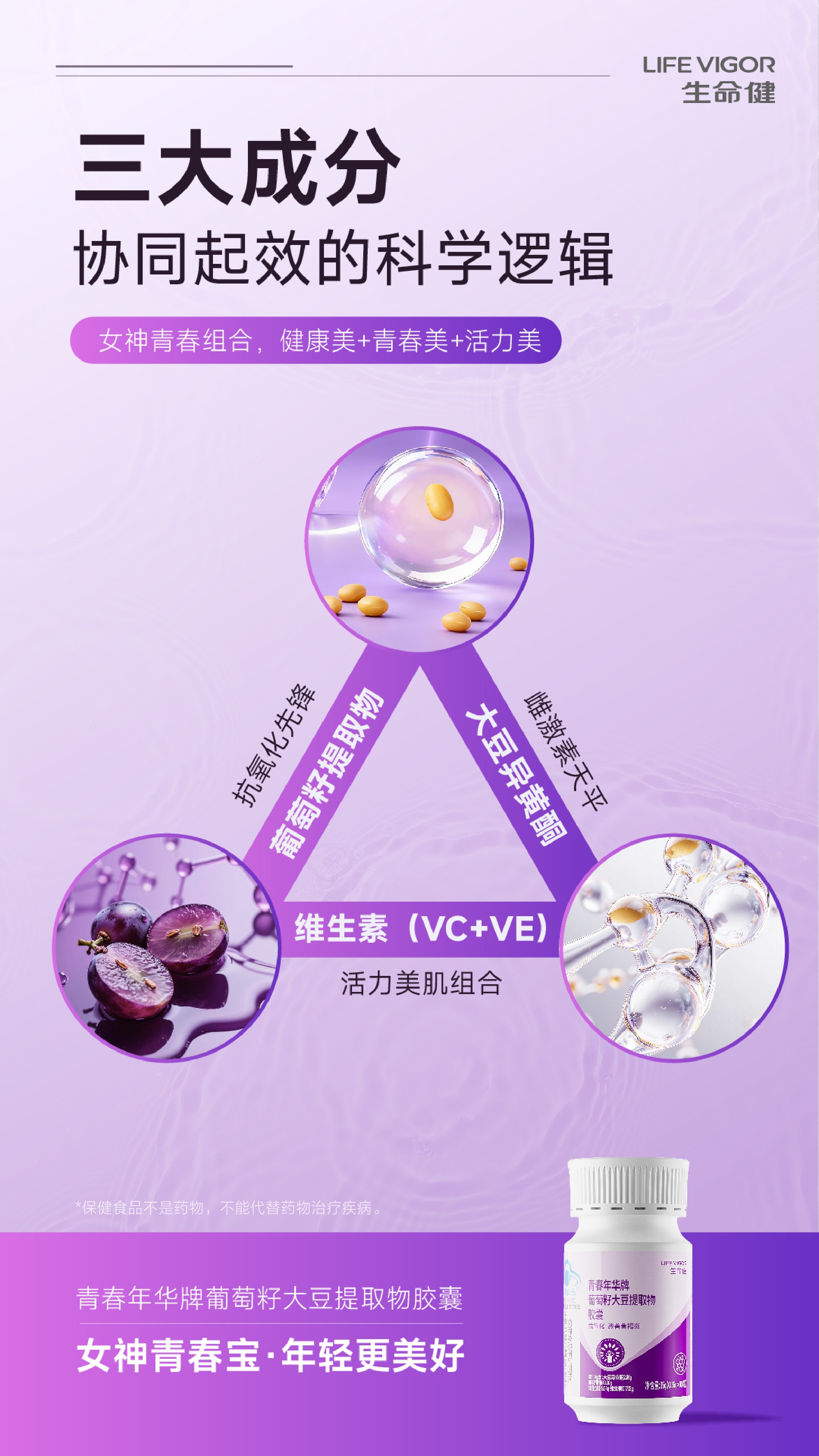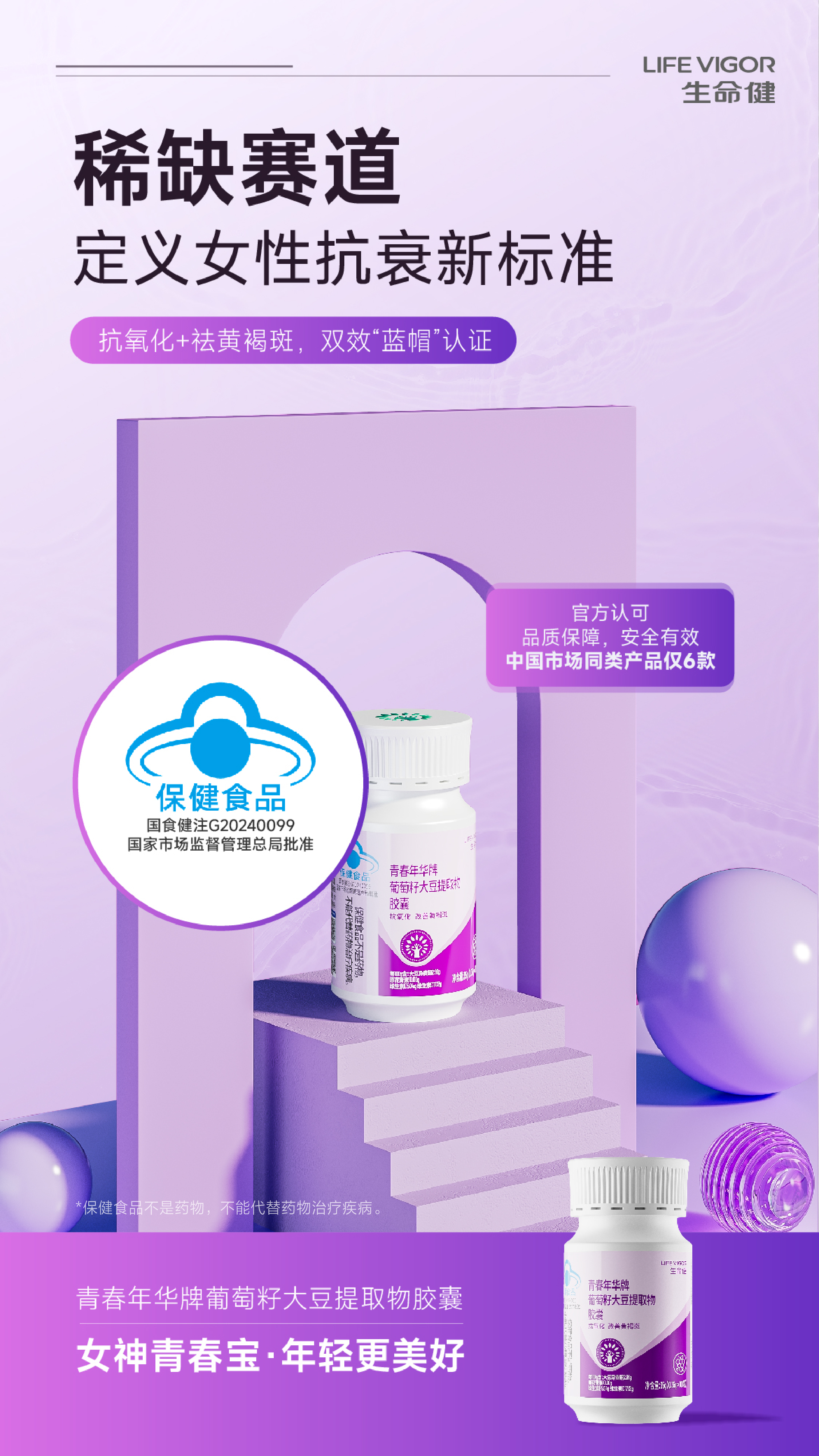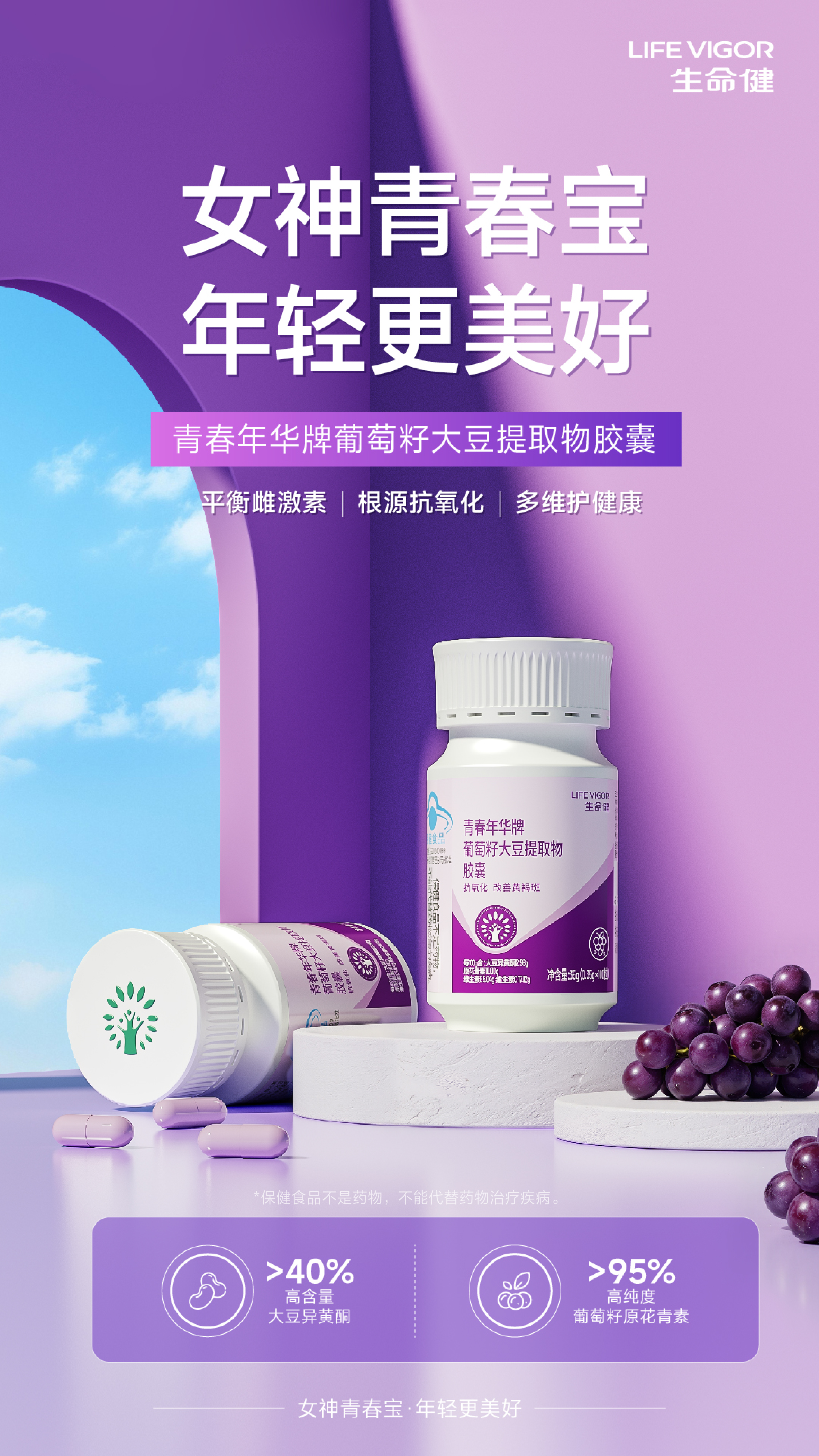 生命健青春年华牌葡萄籽大豆提取物胶囊:女神青春宝,年轻更美好!抗氧化,改善黄褐斑!