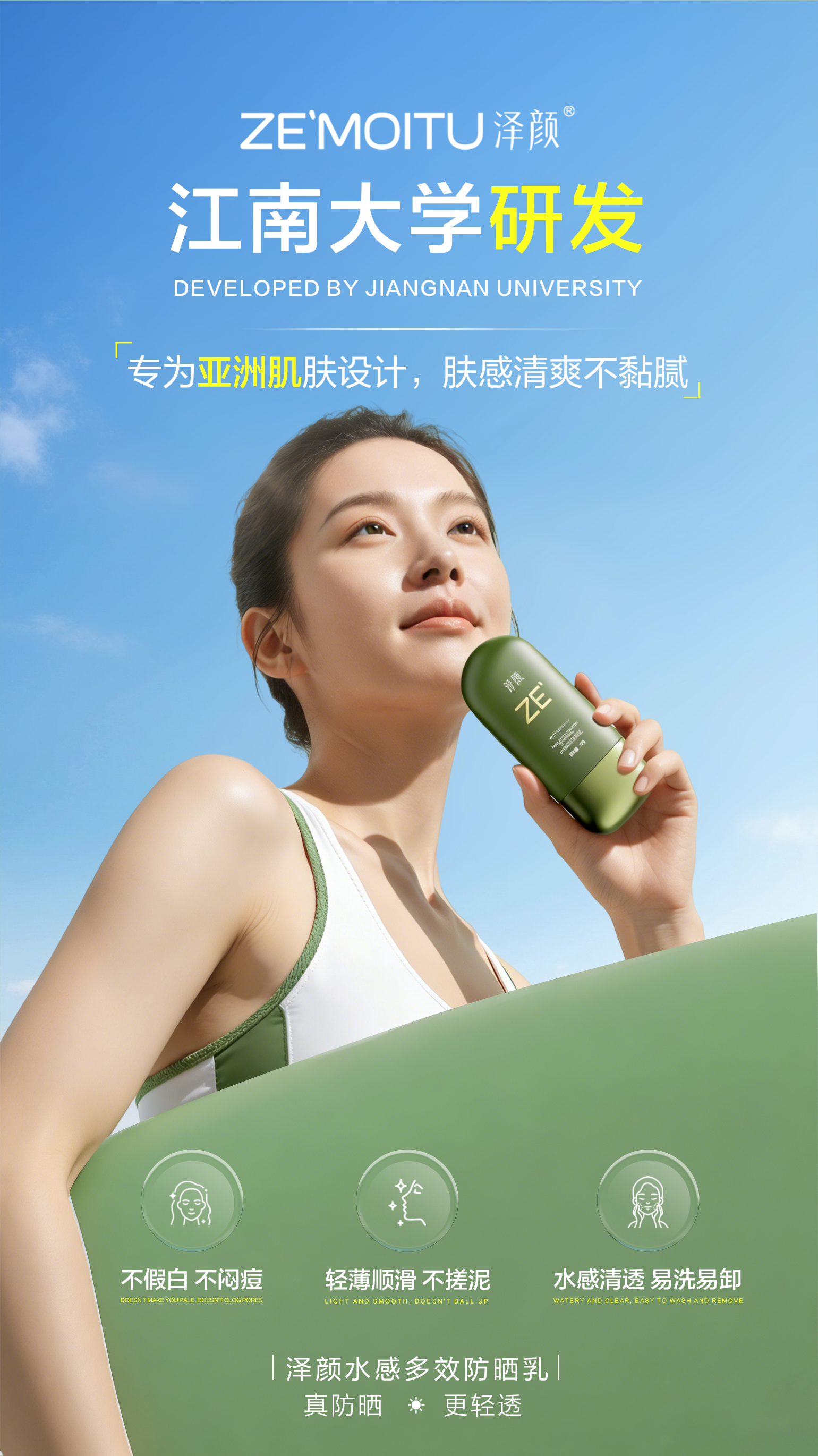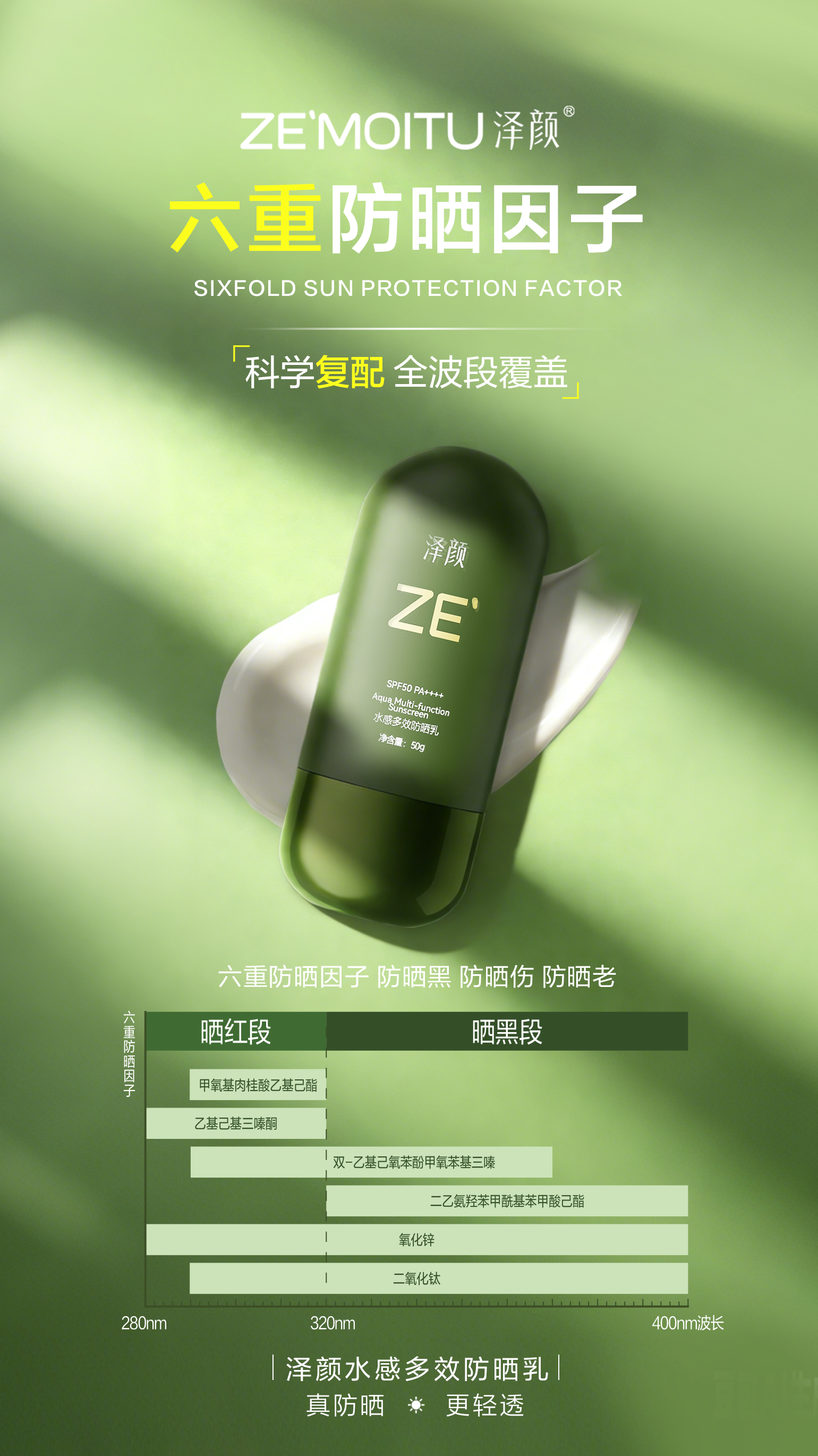 泽颜水感多效防晒乳,新品上市海报来了!三合一防晒科技,构筑360°全方位科学防晒体系,三重养肤植萃,防晒又养肤。高倍防晒,质地清爽,真防晒,更轻透!